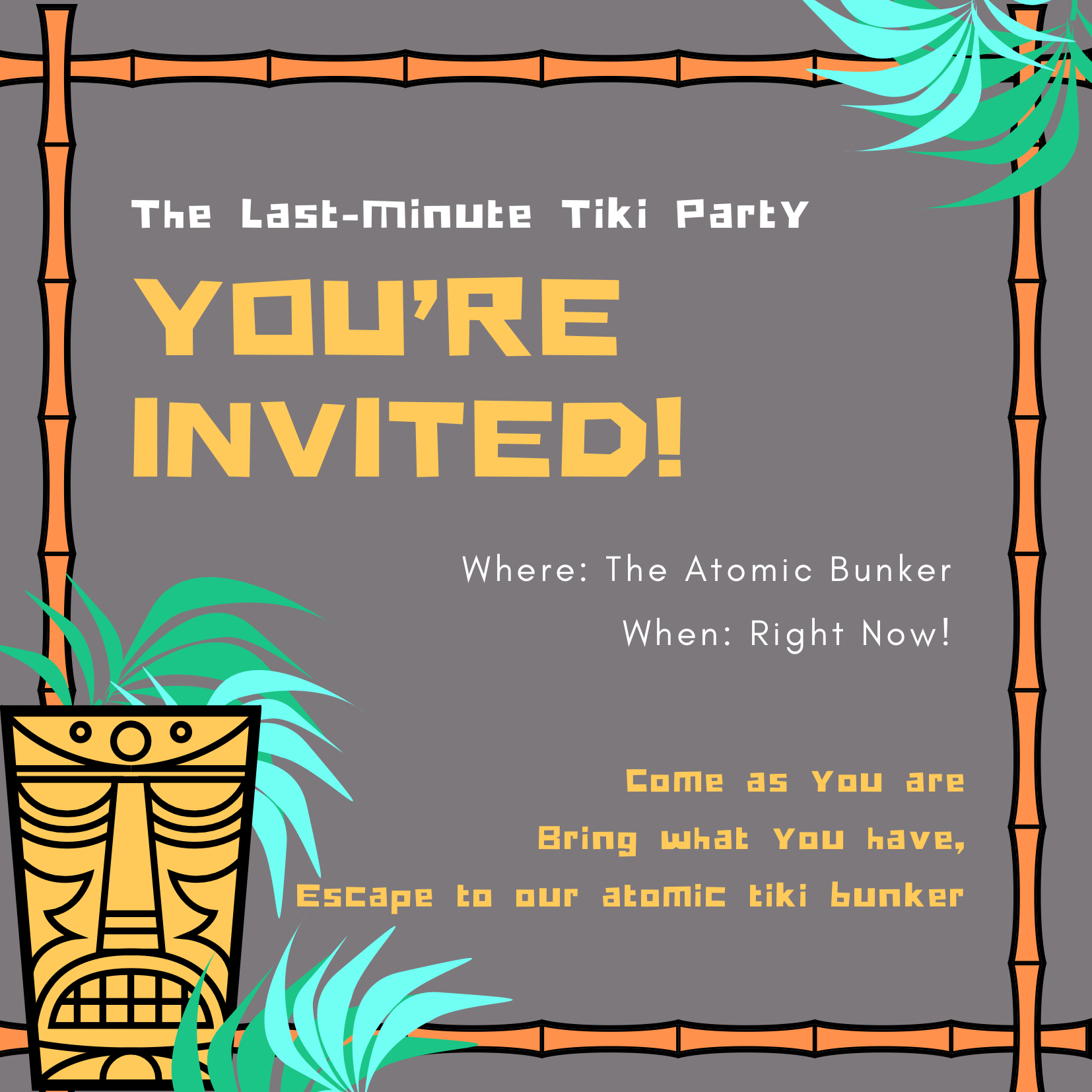 We’re happy you’ve joined our Last-Minute Tiki Party. Our theme is lost in the jungles of midcentury, atomic, “the war is over!”, “the economy is booming!” goodness.